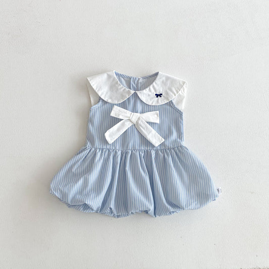 Get ready for sunny days with this playful romper featuring short sleeves and a breezy striped design. The...