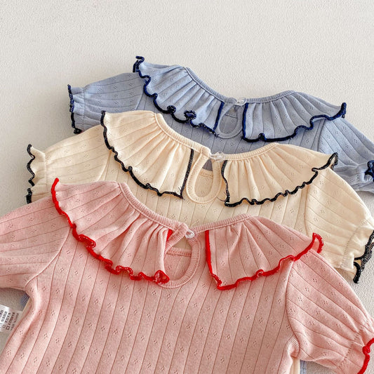 Summer Arrival Baby Girls Short Sleeves Solid Color Hollow-out Pattern Bodysuit with Collar