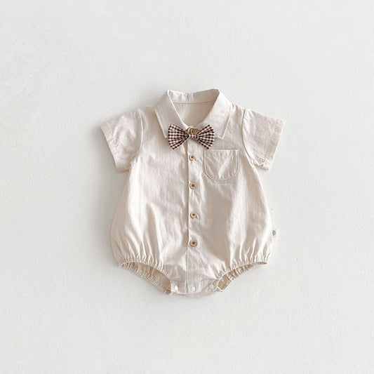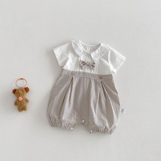 Summer Design Short Sleeves Striped Turn-Down Collar Single Breasted Rompers