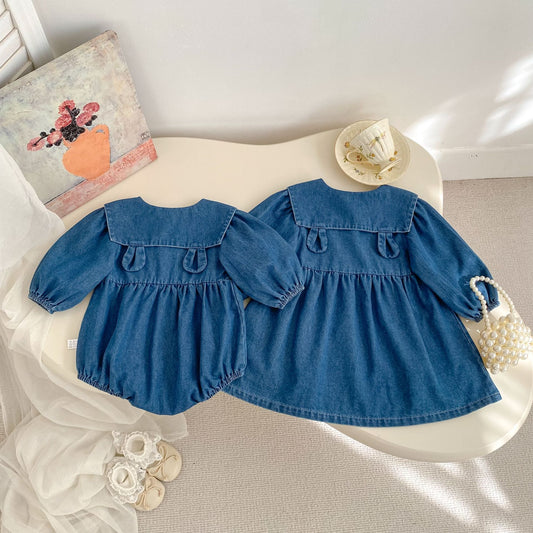 Arrival Spring and Autumn Baby Kids Girls Peter Pan Collar Denim Onesies and Dress – Princess Sister Matching Set