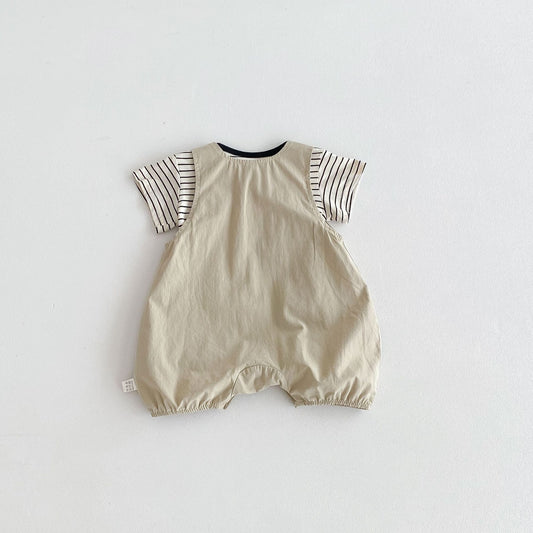 Get ready for sunny days with this playful romper featuring short sleeves and a breezy striped design. The...