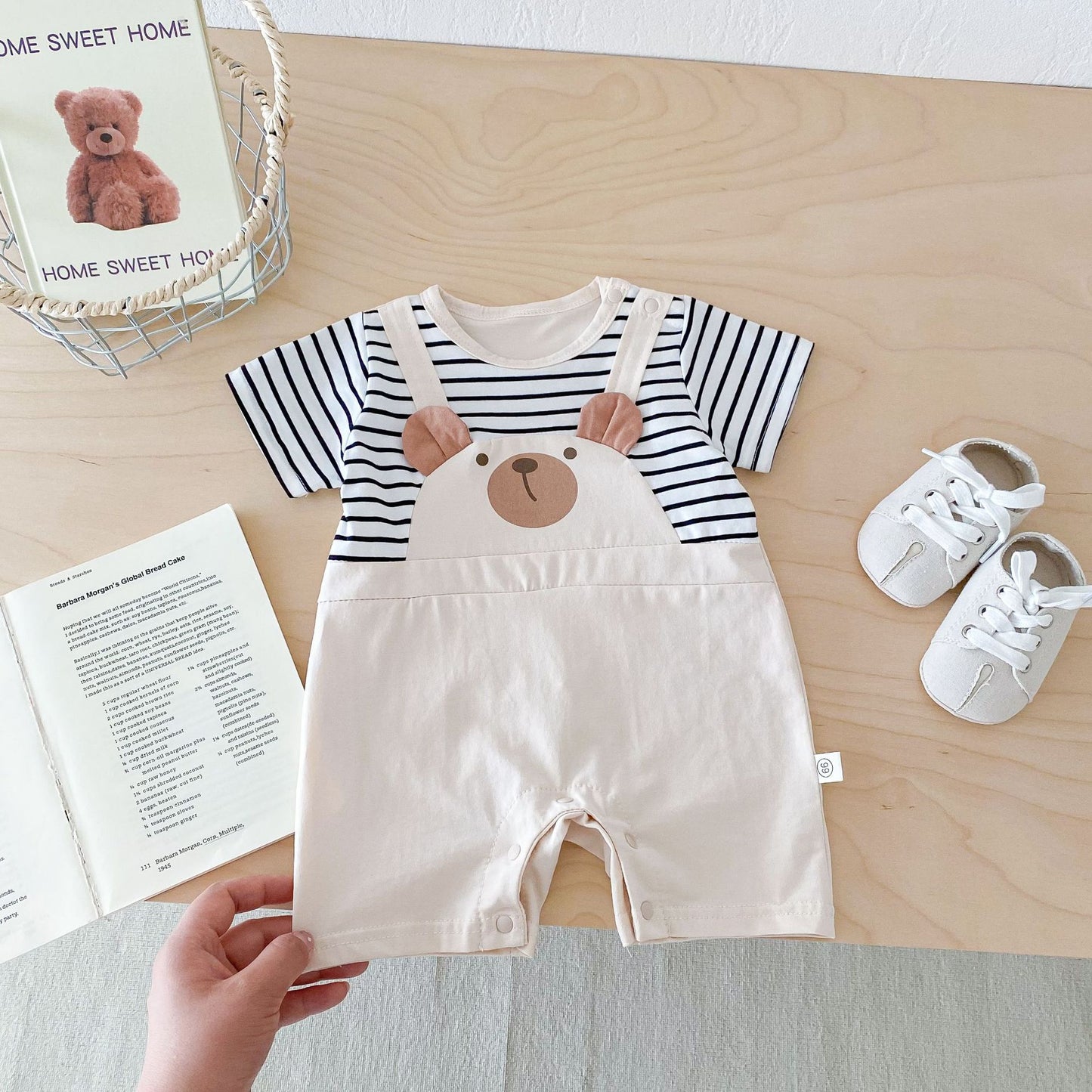 Design Summer Baby Kids Unisex Teddy Bear Pattern Crew Neck Short Sleeves Striped Color Patchwork Romper