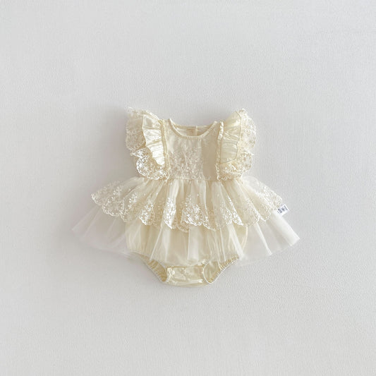 Summer Arrival Baby Girls Short Sleeves Flowers Embroidered Pattern Tulle Bodysuit Dress