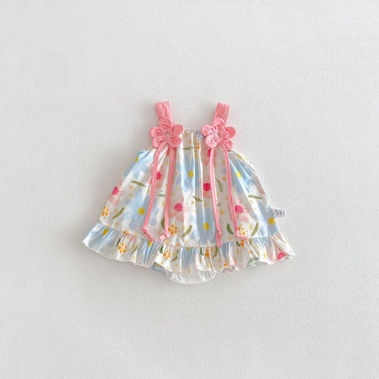 Design Summer Baby Kids Girls Pink Sleeveless Flowers Pattern Strap Bodysuit Dress