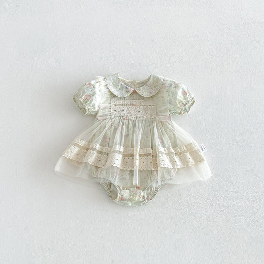 Summer Arrival Baby Girls Short Sleeves Flowers Pattern Tulle Decorated Bodysuit Dress