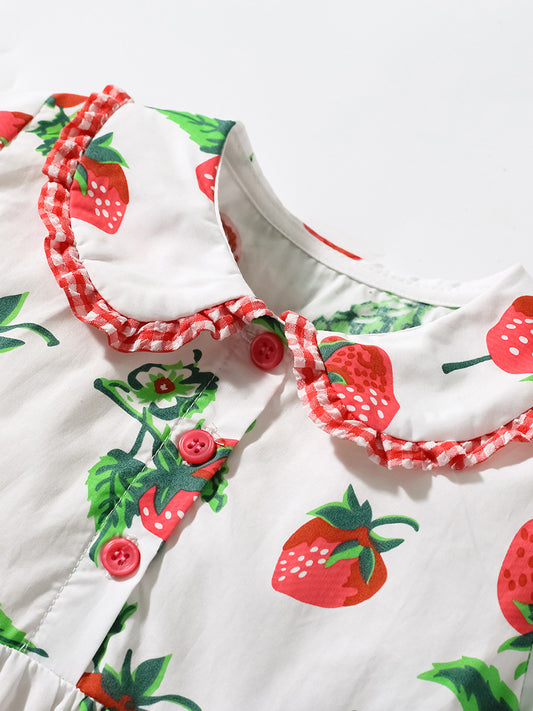 Summer Pure Cotton Strawberry Pattern Short-sleeved Dress with Peter Pan Collar for Stylish Girls