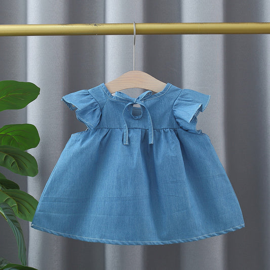 Summer Hot Selling Baby Kids Girls Fly Sleeves Crew Neck Solid Color Denim Dress
