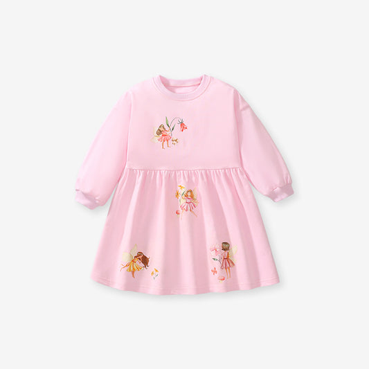 Design Autumn Girls Cartoon Fairy Pattern Crew Neck Long Sleeves Pink Princess Dress