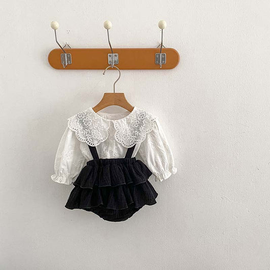 Autumn Baby Kids Girls Solid Color Floral Hollow Out Pattern Long Sleeves Shirt or Ruffle Overalls Onesies – Sister Matching