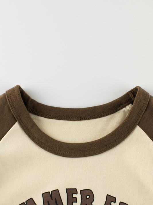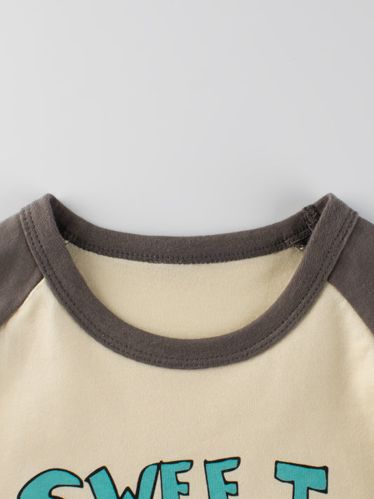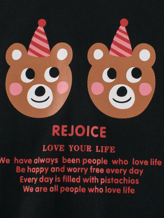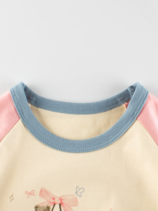 Autumn Arrival Kids Girls Teddy Cartoon Print Crew Neck Long Sleeves Color Patchwork Shirt