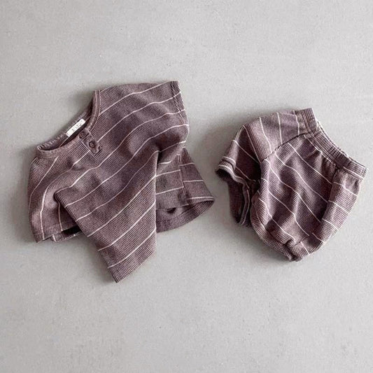 Baby Kids Unisex Striped Short Sleeves Waffle Grid Top And Shorts Casual Clothing Set