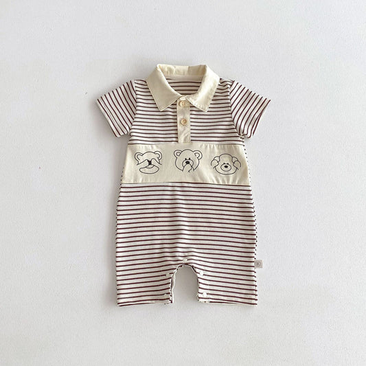 Summer Design Short Sleeves Striped Turn-Down Collar Teddy Pattern Baby Rompers