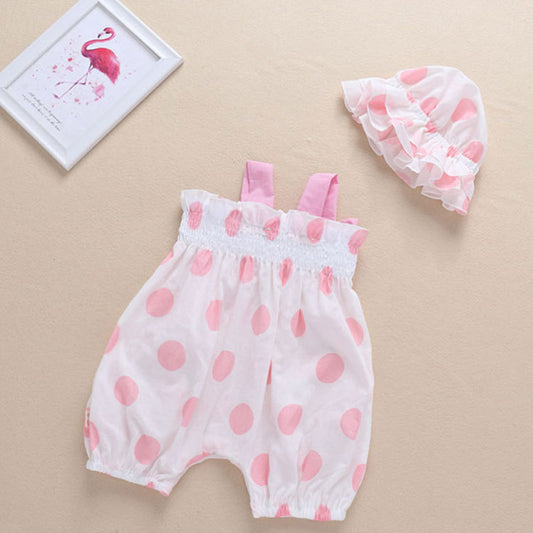 Baby Girl Bow Design Pink Polka Dot Pattern Sleeveless Romper With Hat