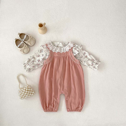 Arrival Autumn Baby Girls Floral Print Long Sleeves Top And Pink Strap Overalls Romper Clothing