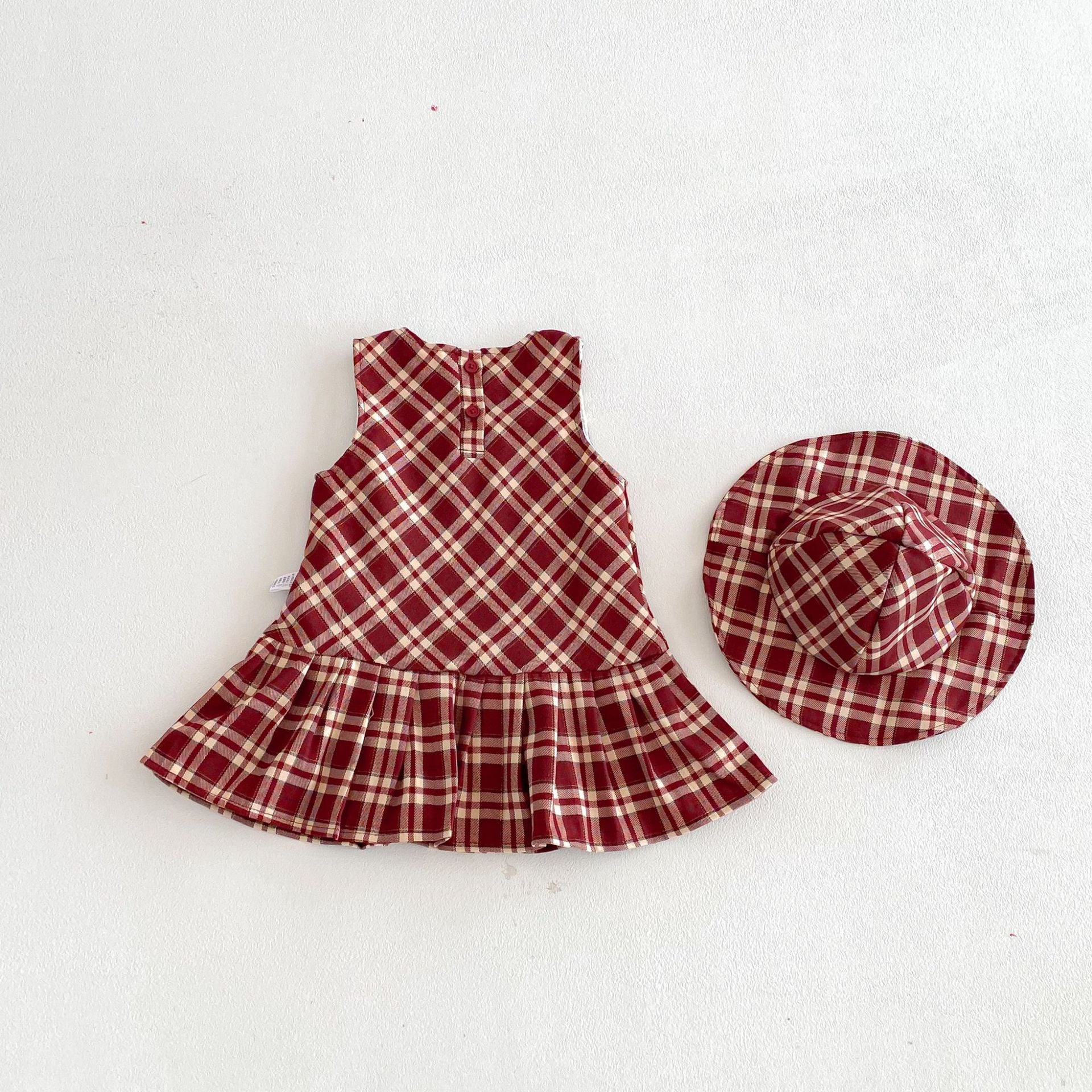 Spring Arrival Baby Kids Girls Cute Argyle and Plaid Pattern Sleeveless Dress with Hat