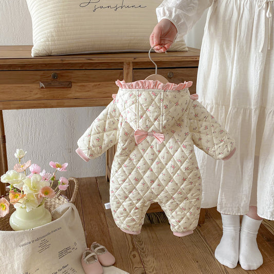 Winter Arrival Baby Girls Long Sleeves Floral Pattern Fleece-Lined Hooded Rompers