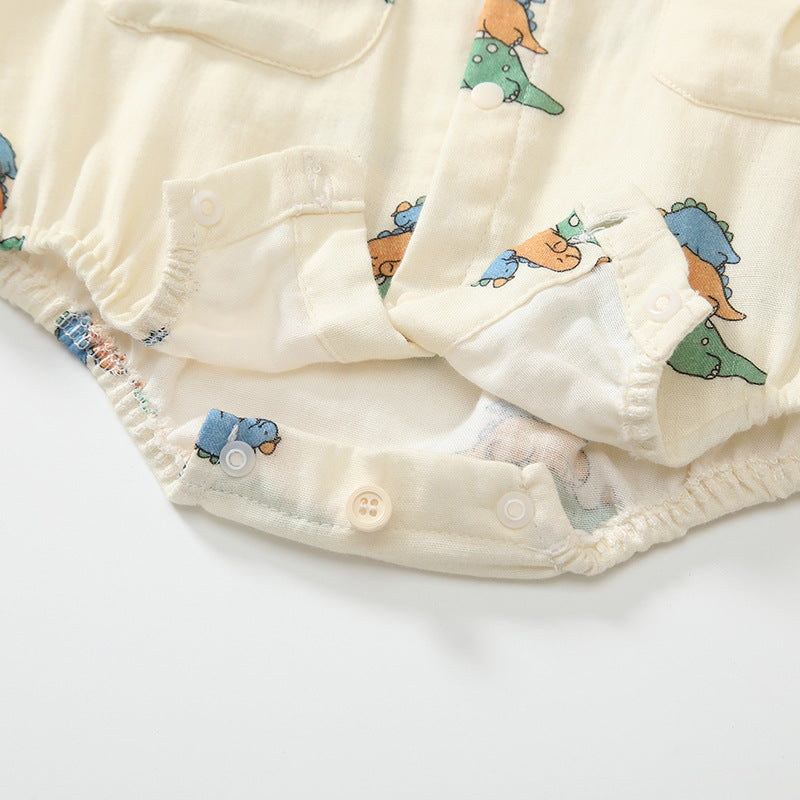 Celebrate your little one’s summer with this charming unisex bodysuit featuring an adorable cartoon dinosaur pattern. Crafted with soft, breathable fabric and short sleeves, it ensures comfort and ease during warm days. The playful design adds a touch of whimsy while providing practical wear for everyday adventures. Perfect for keeping your baby cool and stylish all season long.