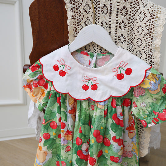 Design Summer Kids Girls Cartoon Oil Painting Print Short Sleeves Embroidered Collar Dress