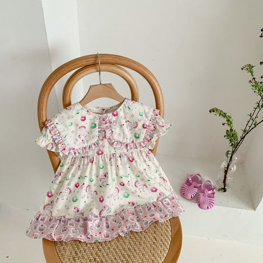 Best Selling Summer Baby Kids Girls Unicorn Floral Pattern Color Patchwork Short Sleeves Dress