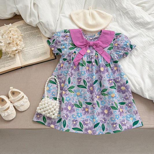 Arrival Summer Girls Floral Print Short Sleeves Bow Design Collar Dress