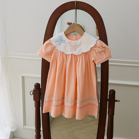 Summer Hot Selling Girls’ Solid Color Short Sleeves Peter Pan Collar Cotton Comfy Dress