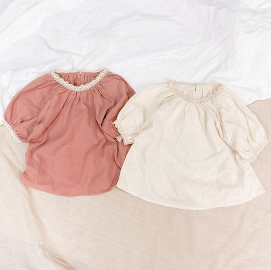 Baby Girls Solid Color Lace Design Puff-Sleeved T-Shirt In Summer