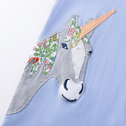 This charming short-sleeve dress features a delightful unicorn cartoon pattern, perfect for stylish girls embracing the summer season. Crafted for comfort and ease, it combines playful design with a refined silhouette, making it an ideal choice for warm days and casual outings.