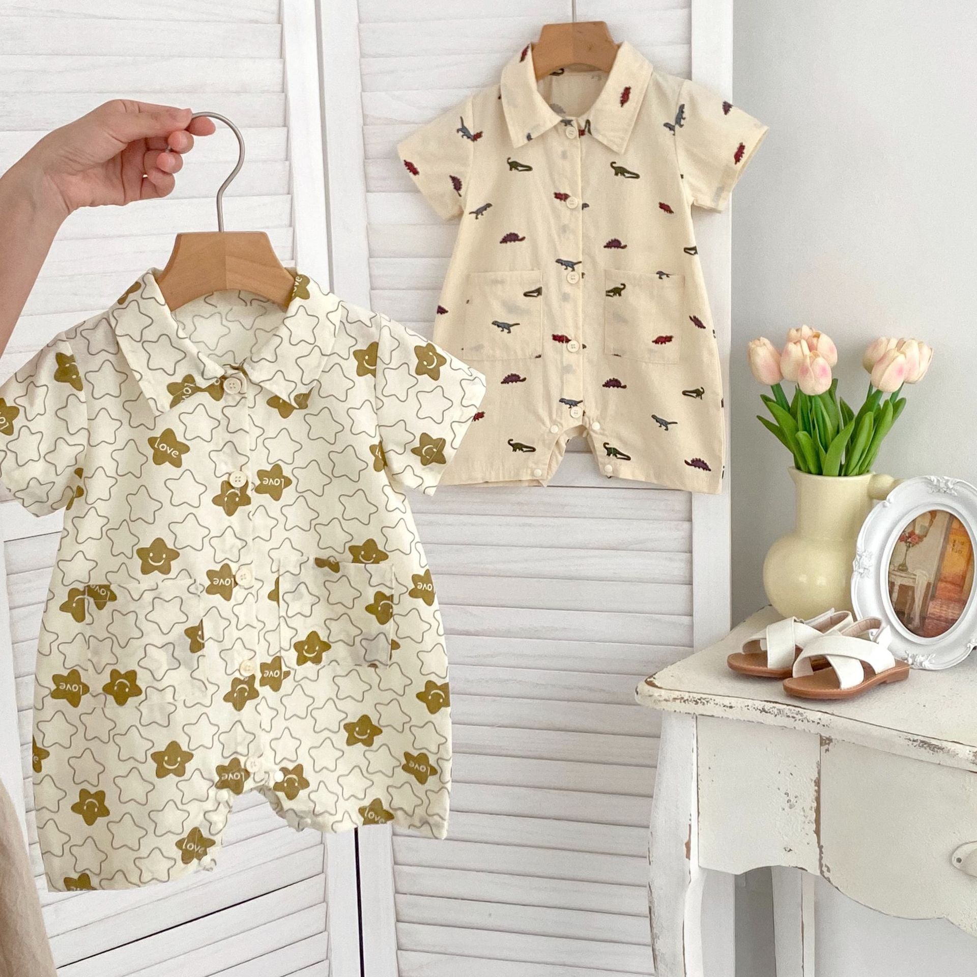 Get your little explorer ready for sunny adventures with these playful short-sleeve baby rompers! Featuring a cool turn-down collar and fun dinosaur and star patterns, they keep your baby comfy and cute all summer long. Lightweight and easy to wear, these rompers are perfect for endless playtime and nap time alike.