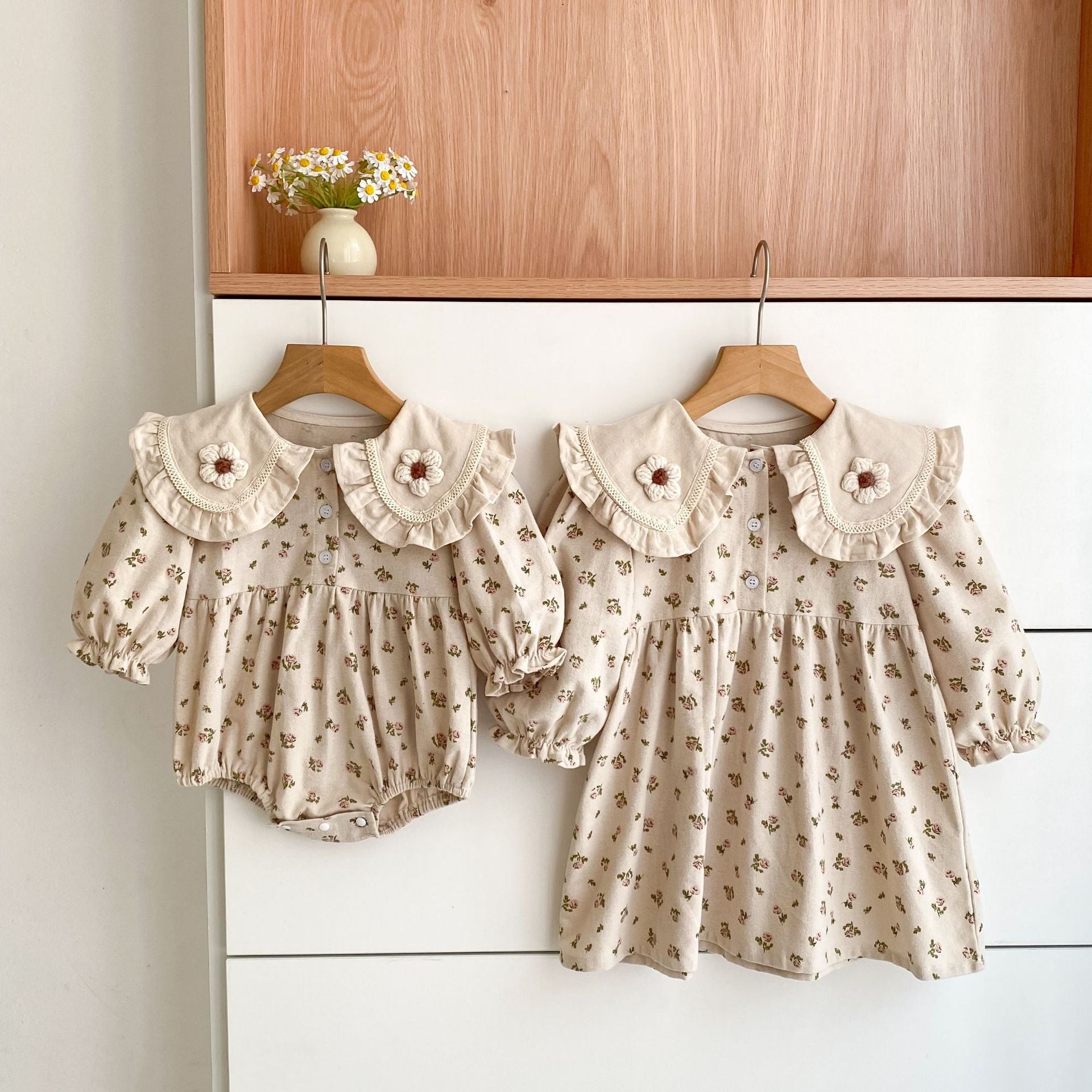 Introduce your little ones to effortless style with this charming floral matching set. Featuring delicate spring and autumn flower patterns, the turn-down collar design adds a touch of classic elegance perfect for sisters. The coordinated onesie and dress combination makes dressing your children a breeze while keeping them looking picture-perfect. Soft, comfortable fabrics ensure all-day wear, whether for playdates, family gatherings, or special occasions. Create those precious matching moments that make childhood memories unforgettable.