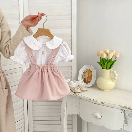 Summer Baby Kids Girls Rabbit Pattern Short Sleeves Top and Onesies Overalls Clothing Set