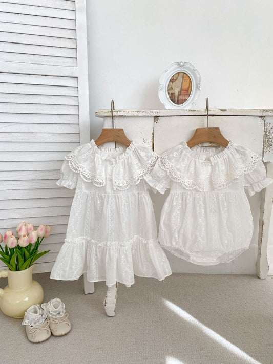 Summer Baby Girls Short Sleeves Floral Pattern Jacquard Dress And Onesie – Princess Sister Matching Set