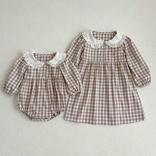 Doll Neck Plaid Pattern Long Sleeve Onesies