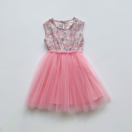 Summer Baby Kids Girls Sleeveless Simple Pattern and Mesh Patchwork Dress