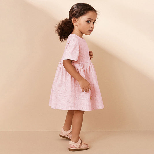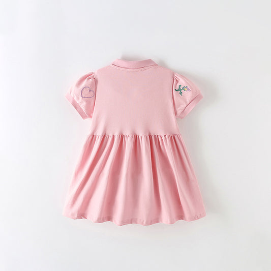 Summer Unicorn Logo Short-sleeved Pink Dress with Turn-down Collar for Stylish Girls