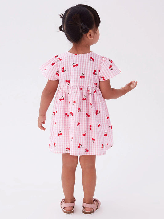 Baby Girls Crew Neck Plaid Cherry Print Short Sleeves Dress