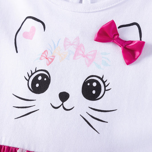 Summer Arrival Cute Cat and Polka Dots Pattern Fly Sleeves Dress for Stylish Girls