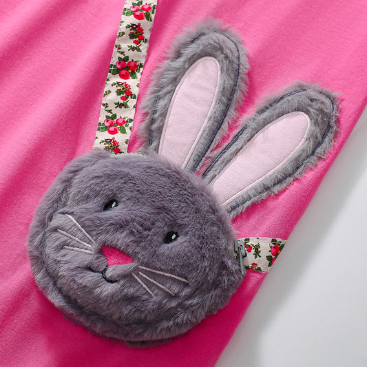 Autumn Arrival Cartoon Rabbits and Flowers Pattern Long Sleeves Crew Neck Dress for Stylish Girls