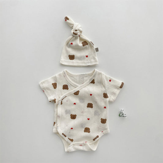 Baby Cartoon Print Tops With Waffle Fabric Strap Onesies Sets
