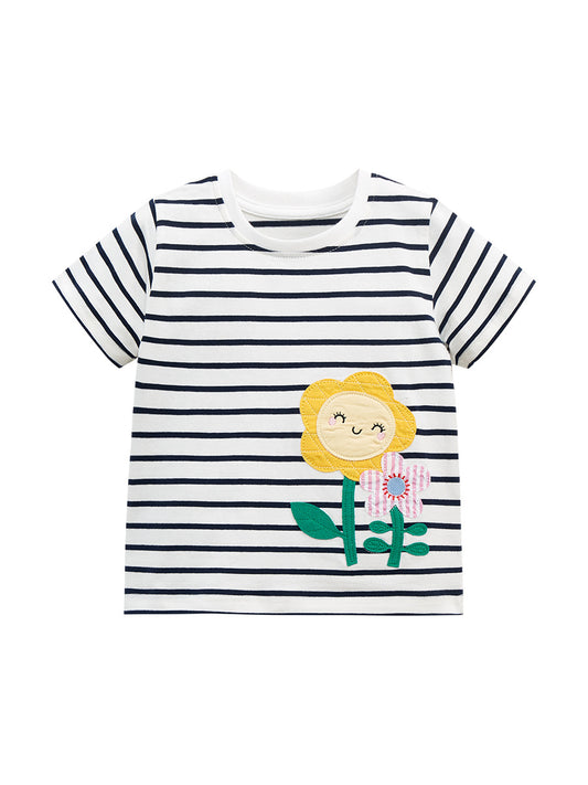 Baby Kids Girls Black Striped Floral Pattern Short Sleeves T-Shirt