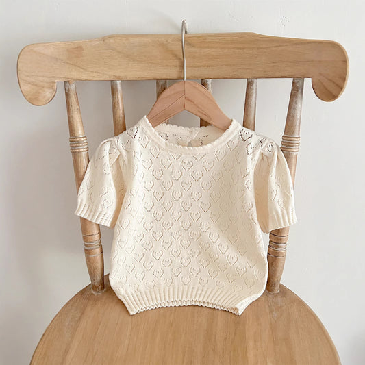 Summer Arrival Baby Kids Girls Comfortable Heart Pattern Knitted Short Sleeves Top