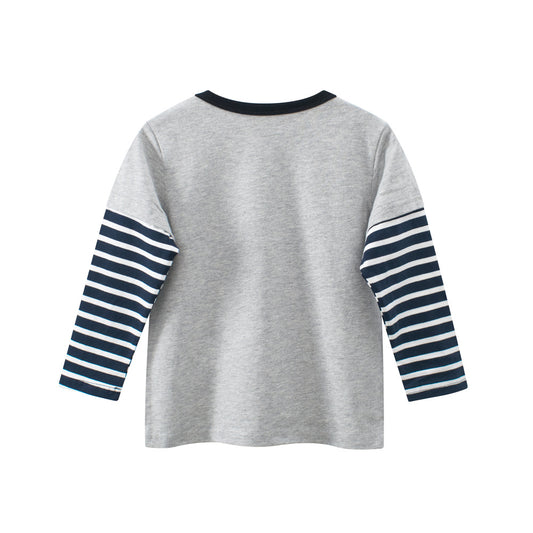 Spring Baby Kids Boys Letters and Cartoon Print Striped Long Sleeves Crew Neck Color Patchwork Top