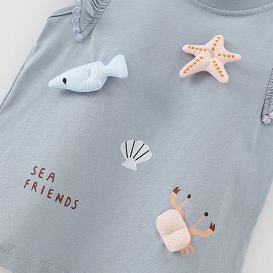 Summer Girls’ Cartoon Marine Animals Pattern Fly Sleeves Top Shirt in European and American Style