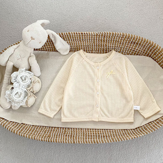 Summer Arrival Baby Girls Simple Long Sleeves Single Breasted Thin Knitted Top with Butterfly-bow