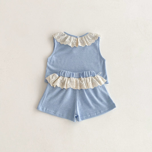 Summer Hot Selling Baby Kids Girls Sleeveless Color Patchwork Flowers Pattern Hollow-out Collar Top Vest and Lace Decorated Shorts Clothing Set