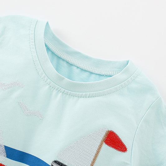 Summer Boys’ English Boats Sail the Sea Cartoon Pattern T-shirt in European and American Style