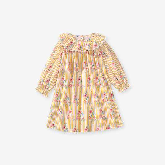 Design Autumn Girls Flowers Pattern Big Collar Long Sleeves Striped Dress