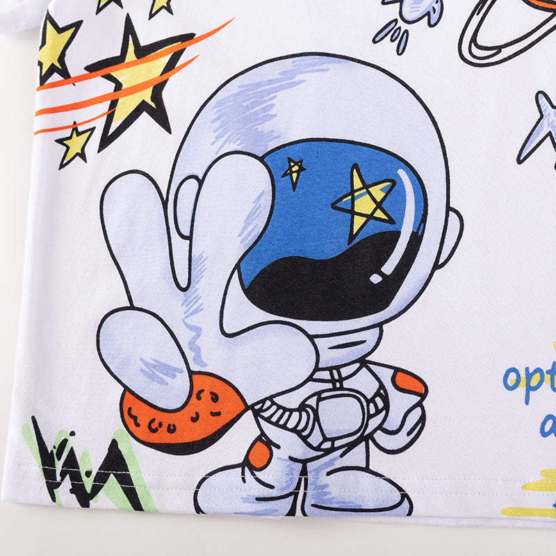 Summer Hot Selling Baby Kids Boys Short Sleeves Cartoon Pattern T-shirt and Black Shorts Clothing Set
