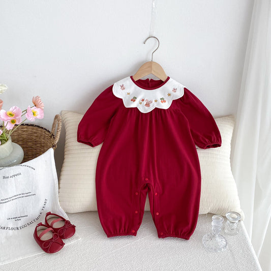 Arrival Baby Girls Long Sleeves Cartoon Embroidered Collar Red Rompers