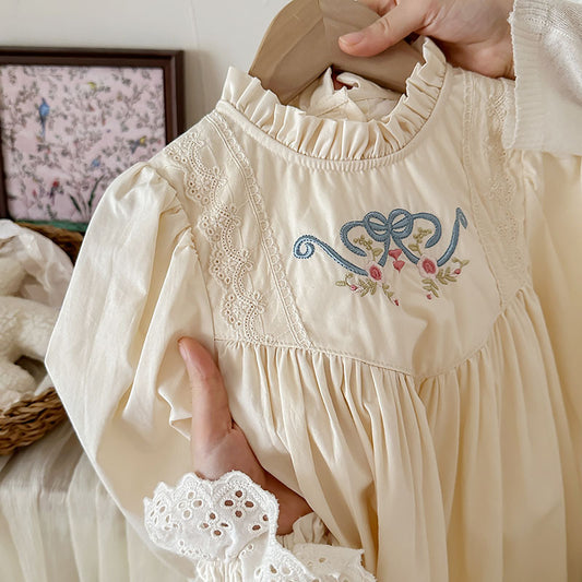 French Style Autumn Girls Flowers and Butterfly-bow Embroidery Pattern Ruffle Neck Long Sleeves Dress