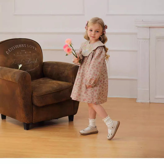 Design Autumn Girls Vintage Floral Long Sleeves Dress with Embroidery Collar
